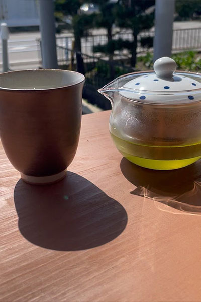淹れるお茶がよりいっそう美味しく見えるよう急須・湯呑は波佐見焼を使用。食に関してはすべて手作り。